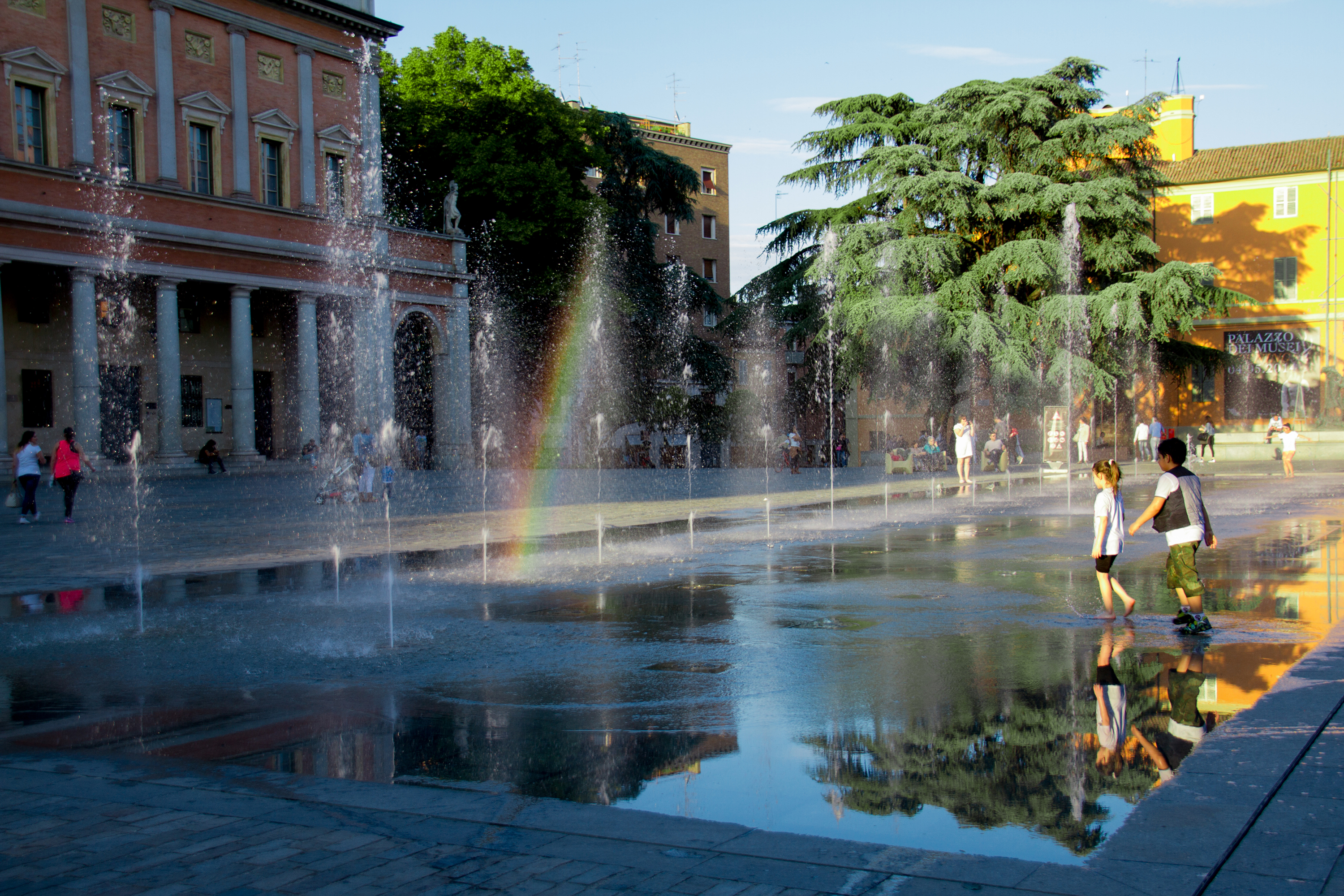 (市の中心部にあるムニキパーレ劇場(Teatro Municipale)前の噴水)
