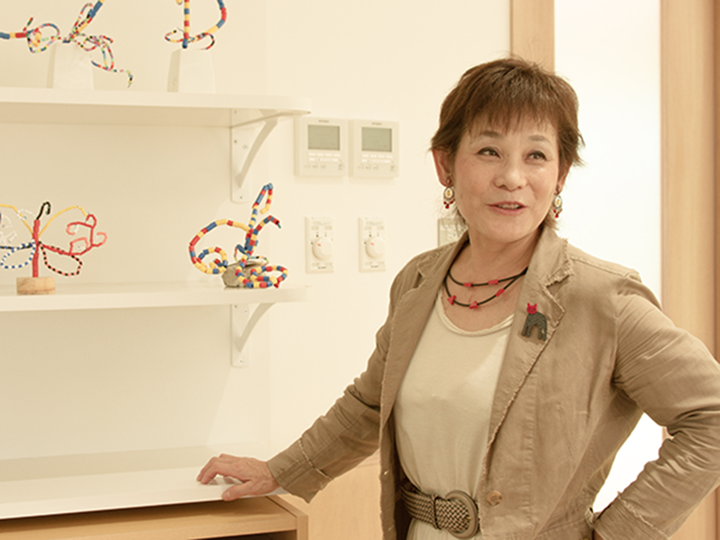 棚の下段、中央二つが、天沼さんがサンプルとして作ってきた作品。