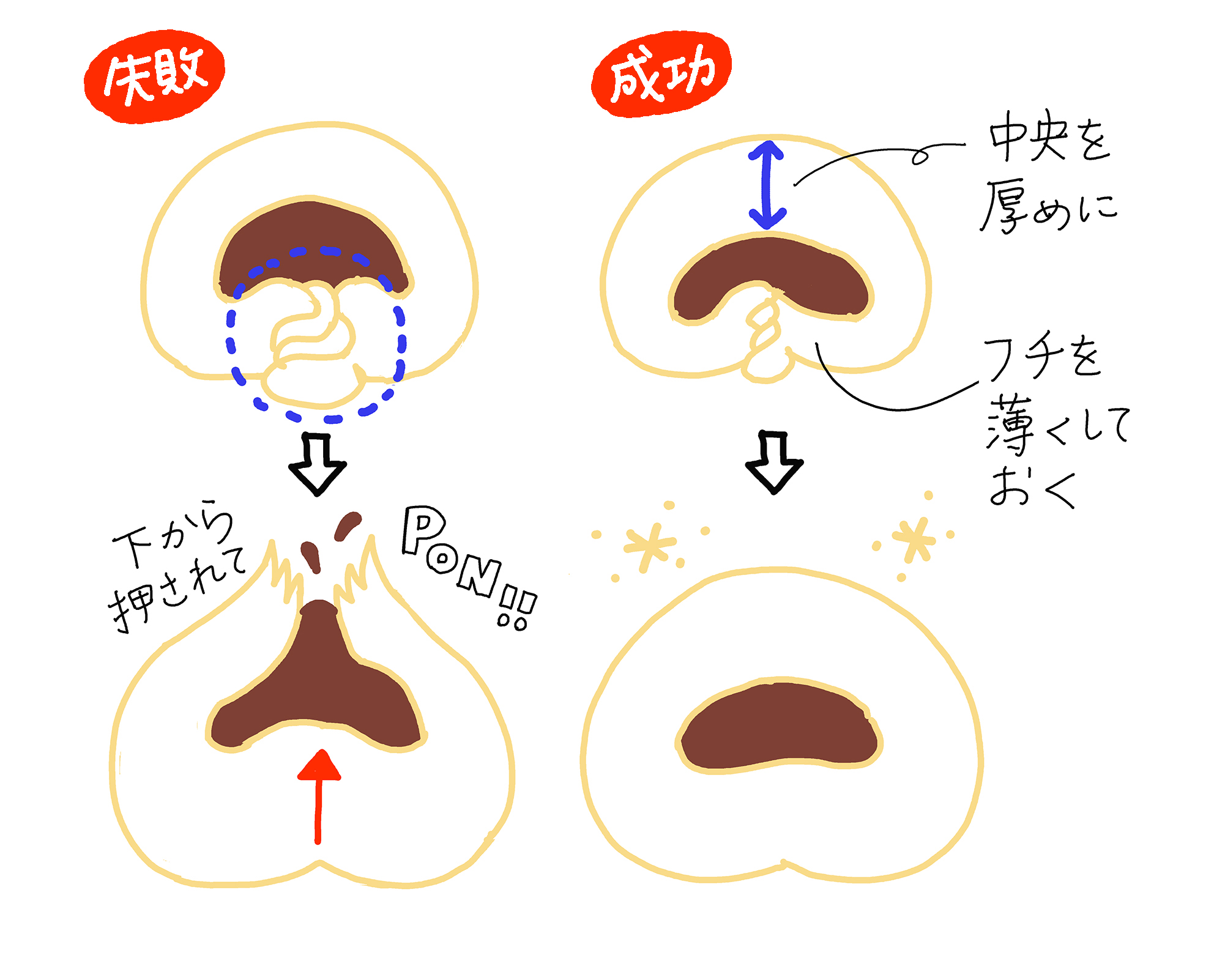 底の生地の量が多いと、底が具を押し上げ、てっぺんが割れてしまいがちなんですね。